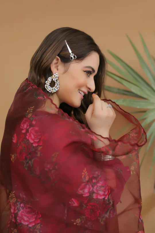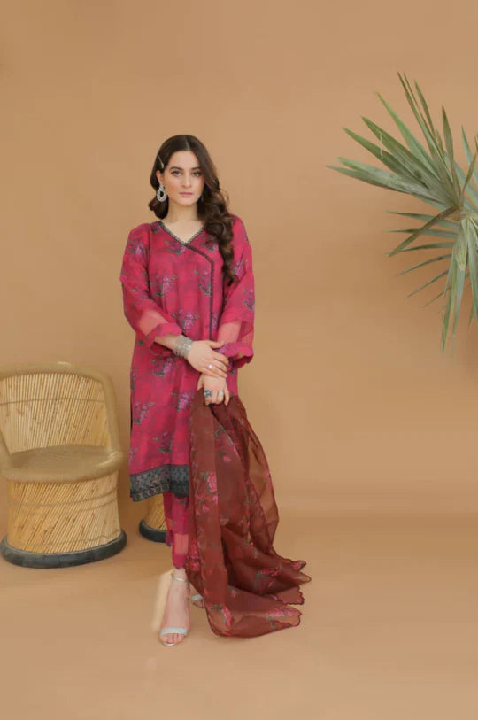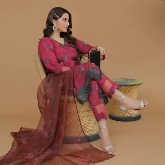 Fabric: Printed Bember Chifoon Dupatta – 2.5 YARDS Printed Linen Shirt – 3YARDS Dyed Trouser – 1.75 YARDS |